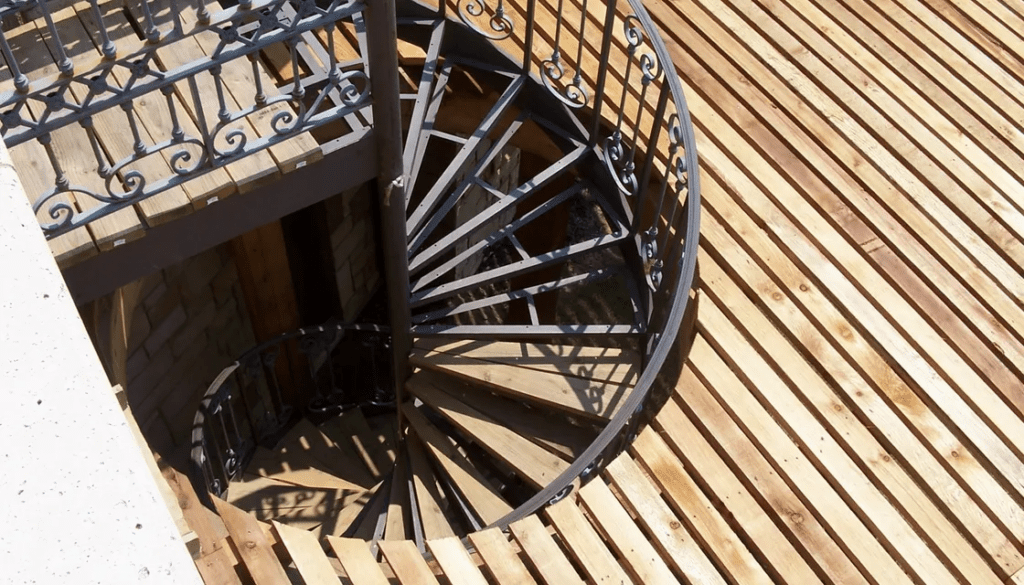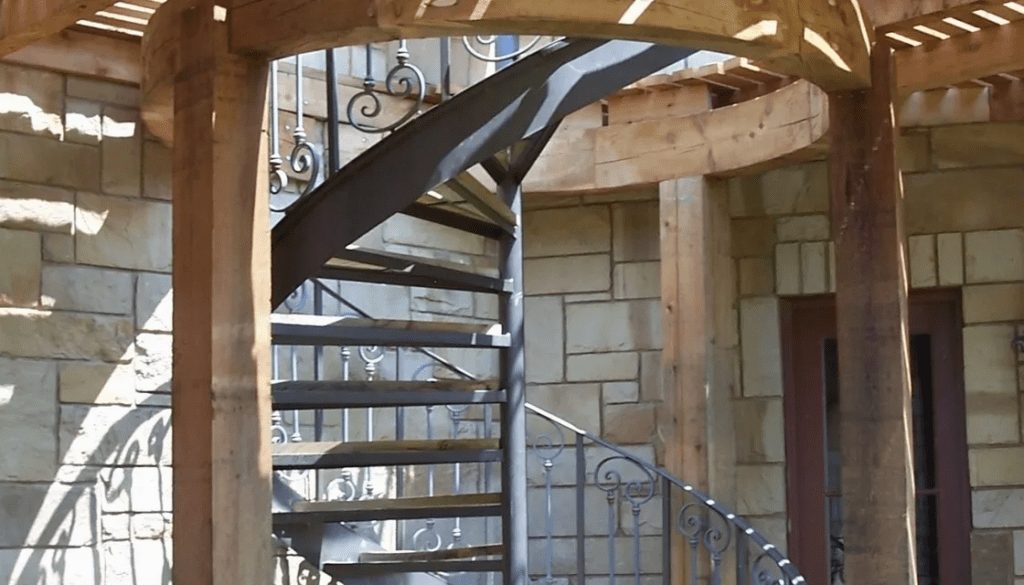 Rustic Cedar Pergola, Arched Openings, Spiral Stairs to Deck